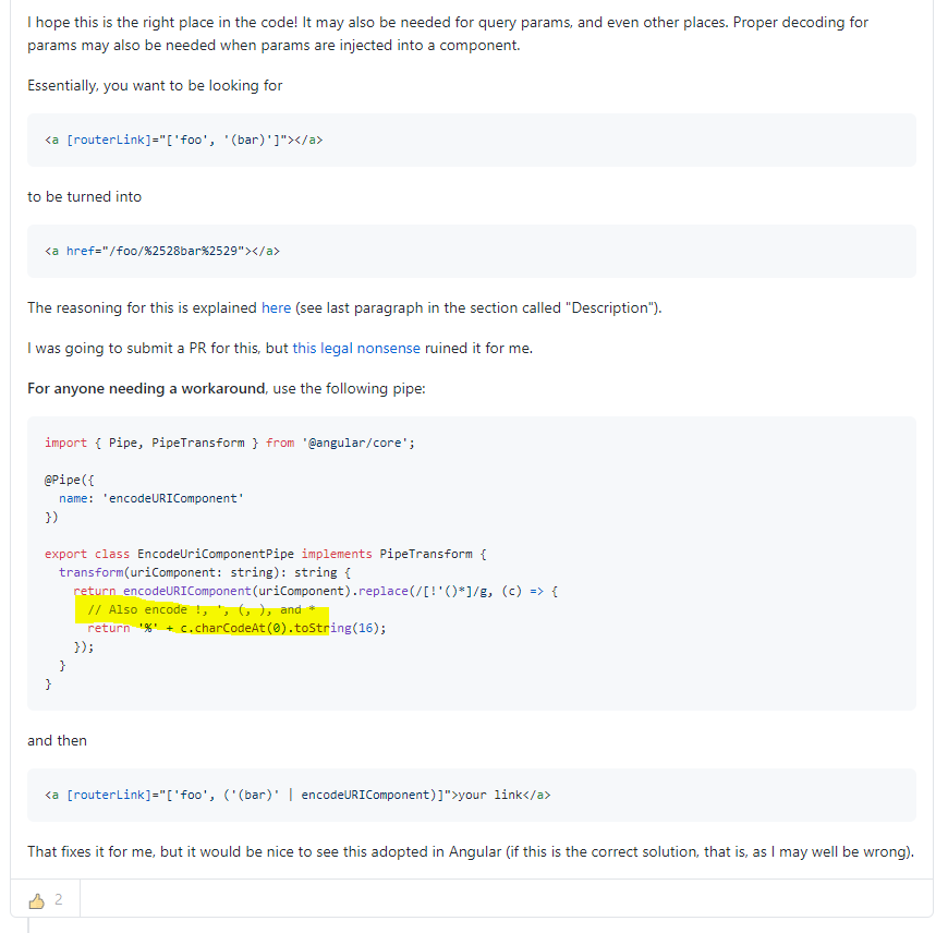 [Angular] Error: Uncaught (in promise): Error: Cannot match any routes. URL Segment: '' 해결 방법 URL parameter에 특수기호가 들어있으면 router 설정을 제대로 해줬다고 생각이 들어도 다음과 같은 에러가 발생할 수 있다. 나 같은 경우는 ( ) 위 괄호들이 문제를 일으켜 다음과 같은 에러를 뱉고, 페이지가 그려지지 않았다. ERROR Error: Uncaught (in promise): Error: Cannot match any routes. URL Segment: 'MSBlaster%2520Worm,%2520Messenger...' Error: Cannot match any routes. URL Segment: 'MSBlaster%2520Worm,%2520Messenger...' at ApplyRedirects.webpackJsonp../node_modules/@angular/route.. Programming/JavaScript & TypeScript 2020.10.08